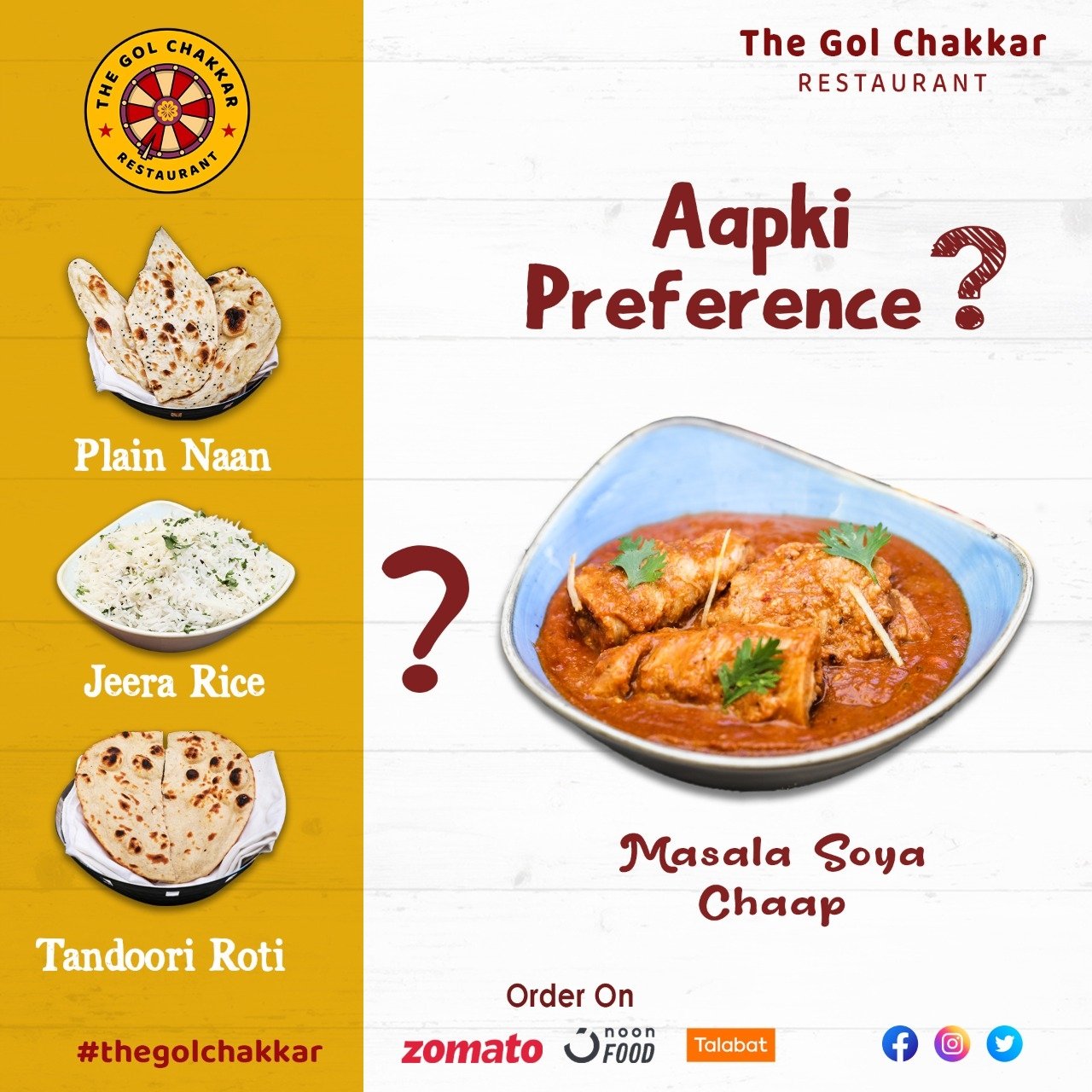 The Gol Chakkar Restaurant On Twitter Aap Kya Pasand Karenge Masala Soya Chaap Ke Saath Me 1 Plainnaan 2 Jeerarice 3 Tandooriroti Rice Soyachaap Naan Indiancuisine Indiancuisines Cuisines Dubaicuisine Tandoori Tandooriroti Roti twitter.com
